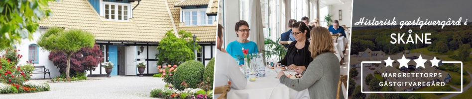 De to halvøer nord for Helsingborg - Bjäre og Kullen – er kendt hos de fleste for naturskønheden og de optimale muligheder for aktiv ferie – og i dag er halvøernes hyggelige, gamle fiskerflækker lidt af et trækplaster for tidens kendisser og velhavere. Men det er en helt anden elite, som gennem tiden har frekventeret Margretetorps Gästgifvaregård, der har ligget i umindelige tider her på kanten af Hallandsåsens bøgeskove og bølgende bakker, som grænser op til Bjärehalvöns pittoreske kystlandskab. Margretetorp siges at være Nordens ældste kro: Den blev grundlagt her på den historisk vigtige handelsrute i 1300-tallet, og myten fortæller, at stedet blev opkaldt efter en af sine første gæster – ingen ringere end Dronning Margrethe d. I, der samlede Norden i Kalmarunionen. Siden har en stribe af historiske berømtheder besøgt gæstgivergården – herunder også det svenske kongepar – og nu er det jeres tur til at få jer en ferieoplevelse ud over det sædvanlige i historiens vingesus.